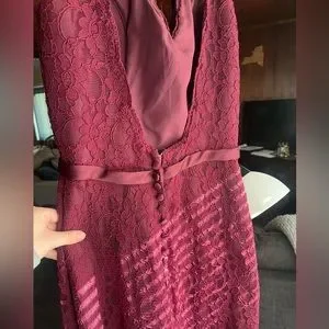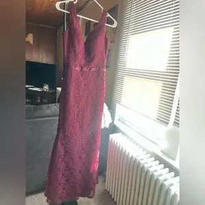 Lace bridesmaid dress in a maroon color. I believe the actual color through Mori Lee is “Bordeaux”