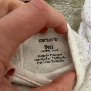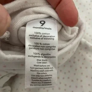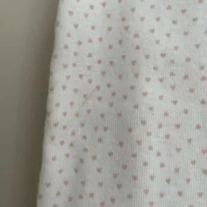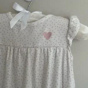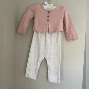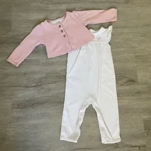 This is an adorable baby jumper set. White sleeveless jumper with tiny heart print with adorable pink cardigan to go over the top. There is one small stain on the back of the jumper. Otherwise, this set is in excellent condition. We used the cardigan independently from the jumper also as it was great with so many outfits!