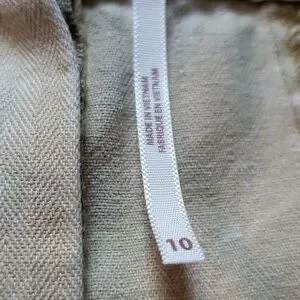 Cool in cargo ... this timeless mini skirt is the perfect throwback-inspired staple! Mid-rise, relaxed silhouette, classic workware pockets with snap button for closure. Single faux pleat in front, back zipper, partial elasticized waistband. 100% Cotton, denim is a vertical two tone slightly washed khaki color. (see all pics) Good condition with very lite gentle wear, button snaps have some lite wear.