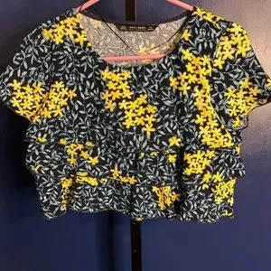 Zara Blue and Yellow Floral Short Sleeve Crop Top Size XS