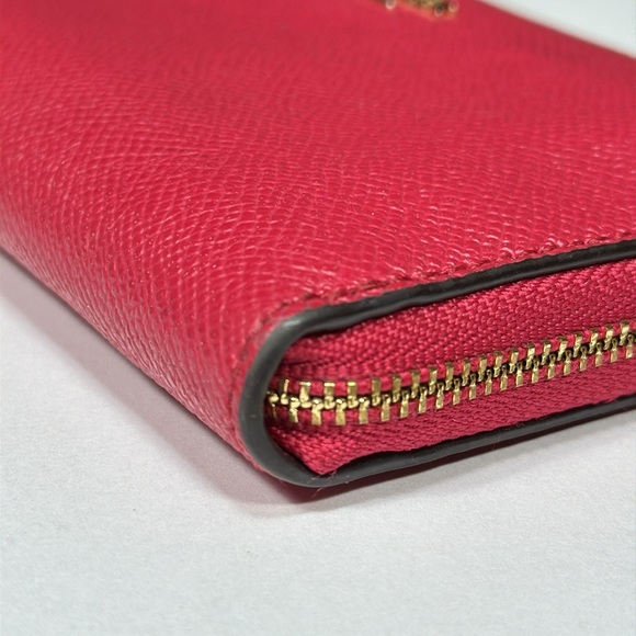 Coach Crossgrain Leather Phone Wallet/Wristlet. Colors is Magenta, hardware is gold. Inside there are 6 card slots, open pocket, zippered coin pocket, and phone pocket (fits phone 5 1/2” x 2 3/4”. There are a couple light marks outside and some minor light signs of use inside and a chip. The wristlet strap has a couple of dents and is going to need reshaping but is not cracked or peeling. See all photos for visual details. Size 6 1/4" (L) x 3 3/4" (H).