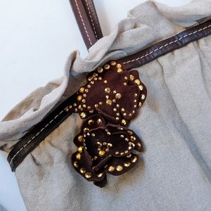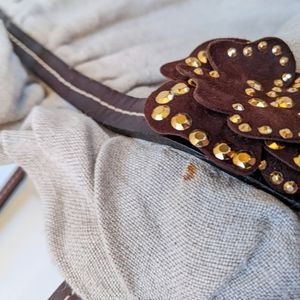 Two brown suede applique flowers with gold stud detailing
