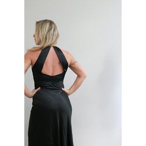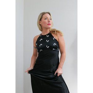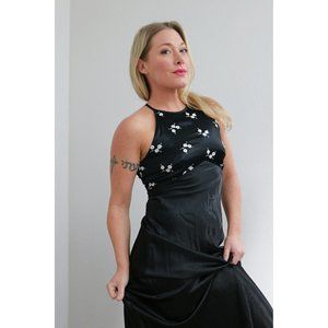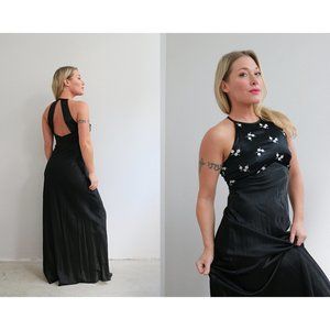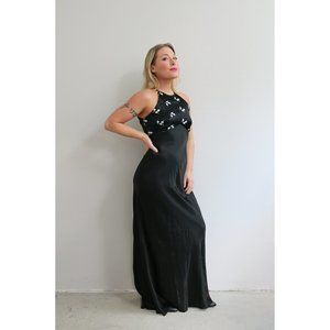 Beautiful 1980's Formal gown in women's size sm/md. Slip on style with bias cut fabric for a stunning fit that has great movement. The back has a great strappy detail. Fully lined. Gradient style beading on the chest. Fabric is a polyester chiffon in black. In excellent vintage condition with no flaws to note.