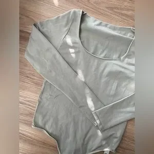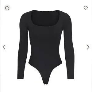 “This long sleeve scoop neck bodysuit is smoothing, supportive, and fits like a second skin. Features a raw cut scoop neckline, double snap closure at the bottom gusset, and a thong back for no panty lines. Fits true to size.”