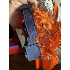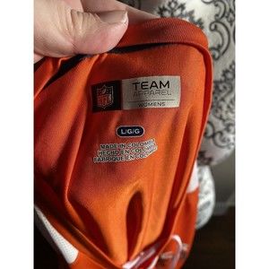 Up for auction is a lot of Denver Broncos items. The first is a ladies jersey style top in size large. It has lace style neckline and rhinestones on the front. 18.5 across the front of the chest and 27 from shoulder to bottom. Form fitting. The material does have stretch to it. The second item is a visor/hat with the Broncos logo on the front. It has the faux fur orange hair on top and adjustable strap in the back. Both items are in good condition.