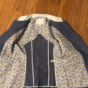 Blue linen 4 front pocket blazer. Can be button up to the neck. Beautiful floral lining.sleeves can be rolled to show the white lining. Excellent condition