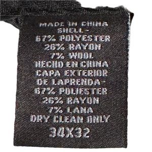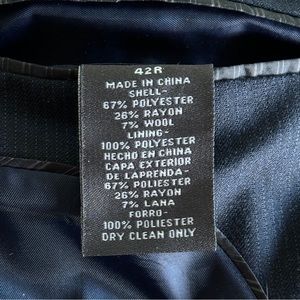 Men's Arrow Wool-Blend Navy Blue Pinstripe Suit 42R [jacket] 34x32 [pants] Wool-blend [67% Polyester, 26% Rayon, 7% Wool] This suit was only worn a couple of times. It was dry cleaned before storing.