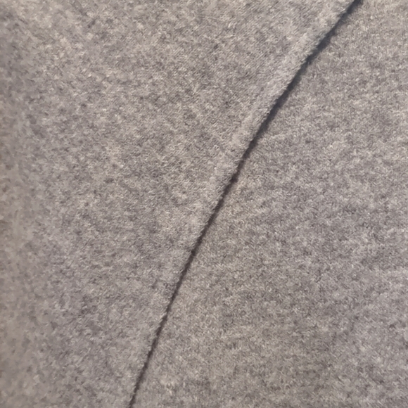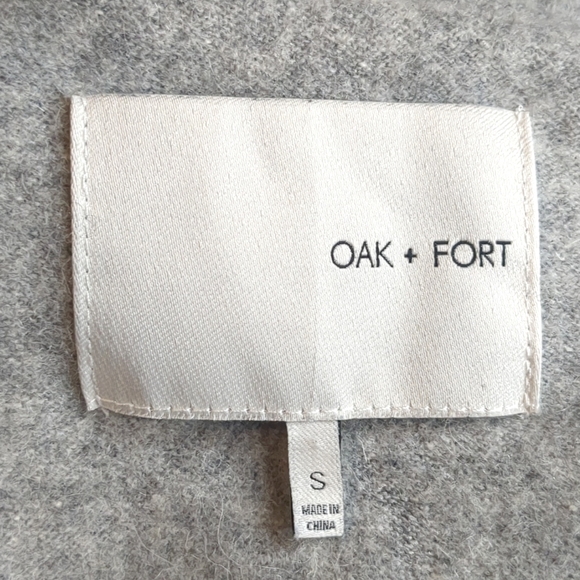 Grey wool blend open front sweater by Oak + Fort. Blazer style lapels and pockets. Approximately knee to calf length. Medium weight for comfort.