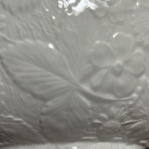 - An all-over pattern of White Embossed Grapes & Grape Leaves and Strawberries & Strawberry Leaves and Strawberry Blossoms
