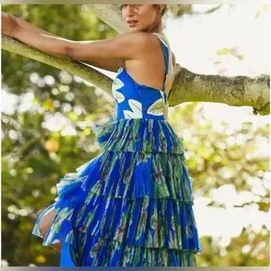 Size 10 Hutch Mariah Sleeveless Tiered Dress in Coastal Bliss. Worn for a photo shoot, does have white deodorant marks on inside blue material shown in pics. Bust 19”, waist 16.5”, length 55”. Stunning blue color and tulle layers.