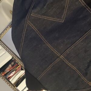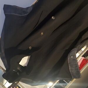 high collar and cape sleeves with snap buttons. contrast fabric, denim trim, side vents at hem, front hidden button closure