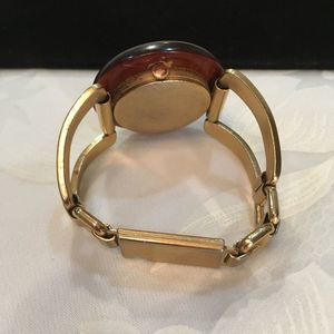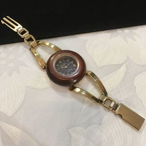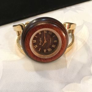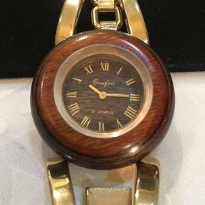 Vintage Crawford 21J gold tone bracelet style winding watch with wood face. In excellent working condition. Watch measures 6 1/2 inches long. Band measures 1 1/4 inches at its widest point. Wooden face measures 1 5/8 inches in diameter. Movement and face are almost 1/2 inch deep.