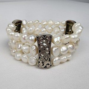 WHITE Faux Pearl Filigree Silver Stretch Bracelet