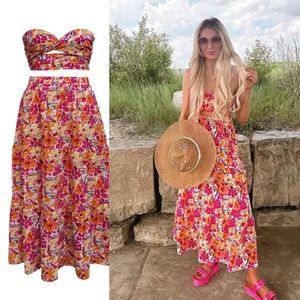 2 Piece Set Floral Strapless Top & High Waist Flared Maxi Skirt Pink Yellow