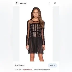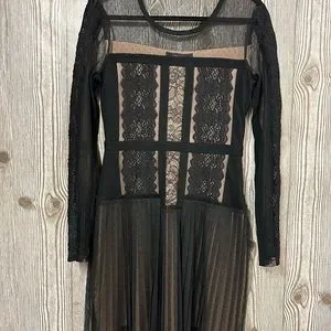 size small, black lace, dress with nude underlining, pleated lace, bottom, sheer sleeves, sheer upper, round neck, collar, size small, BCBG, Max Azria, 18 inches across pit to pit, has stretch, 35 1/2 inches in links. Sold out on Revolve