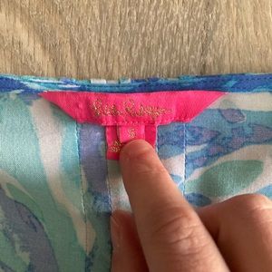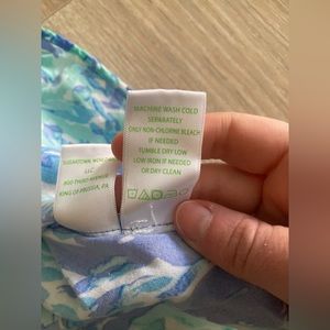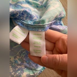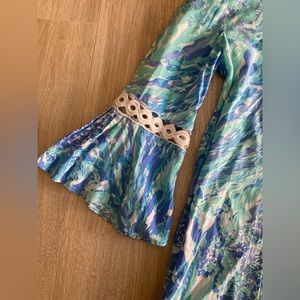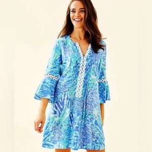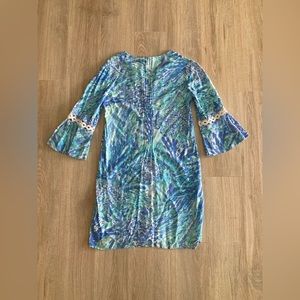 This Lilly Pulitzer tunic dress is their Hollie style in the Hey Hey Soleil color/pattern. The sleeves are 3/4 and there is a lace detail on the front and sleeves. The material is rayon and lightweight! In very good condition with minor wash wear!