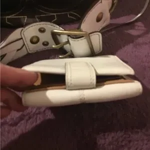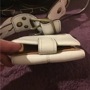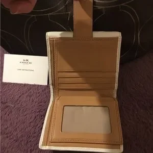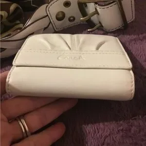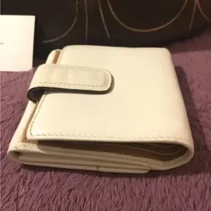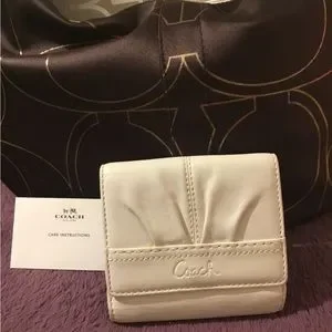 This Is A Really Beautiful All White Leather Vintage Coach Bifold Wallet Which Has 2 Snap Closure. So nice & Clean & In Excellent Undamaged Condition. No Pealing, Cracks Or Pealing Outside Of The Wallet . Maybe A Few Surface Scratches As Not Brand New, The Inside Is Very Clean & In Excellent Condition.The Wallet Has A Lot of Room , 2 Bill Compartments & One Side For Coins only .The Other is For 4 Credit Card Slots & A Place For Your Photo I D, Very Nice Consider The Age Of This Lovely Wallet. I Actually Bought This To Use With The Beautiful Sateen Coach Bag Listed Years Ago. It Has Not Been Cleaned or Conditioned Yet & Look How Clean & White It is! Amazing. It Measures Around 4” x 4” See Pictures For Further Details Please. Ty