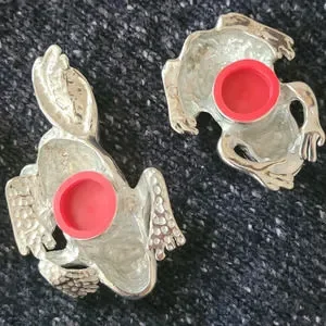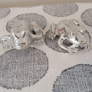 Pewter frog-shaped salt and pepper shakers. NOT pewter colored, they have a silver finish of some sort. Very lean, stoppers are tight and work well. Small-volume.