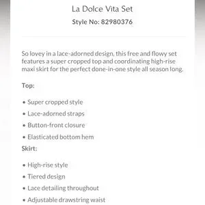 So lovey in a lace-adorned design, this free and flowy set features a super cropped top and coordinating high-rise maxi skirt for the perfect done-in-one style all season long.
