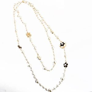 Fa White Pearls & shiny Onyx Black and satin white Necklace beaded charm Camellia Flower gold chain & number 5 Long sweater jewelry necklace can be double wrapped, flowers are ceramic coated on both sides for 3D volume randomly fully black or white and combo of both, #5 has micro white pearls on one side, and Matratze tartan texture on free of pearls gold in the other.
