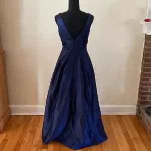 David’s Bridal Navy Blue bridesmaids dress size 10.material 100% polyester. Dress has pockets and a satin look. The skirt has tulle at the bottom for volume and a zipper up the back. Dress was only worn once and altered in length to fit 5’2” frame with heels. Stored in a smoke and pet free home.