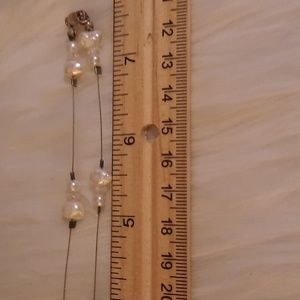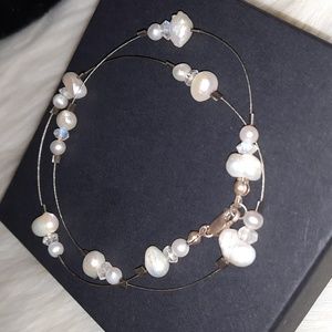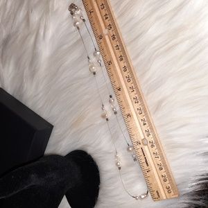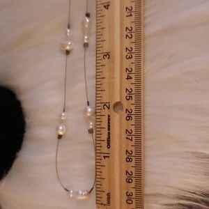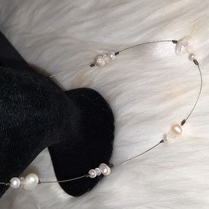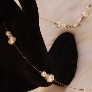 genuine pearl station necklace sterling silver 925 stamped on lobster clasp. good preloved condition clasp and wire needs cleaned, all pearls have great finish. features small round pearls and larger pearls, the main one shaped like a heart. crystal ab coated faceted beads as well. 16in approx length end to end. please see pictures for details and measurements and condition other items are display only