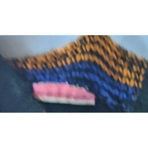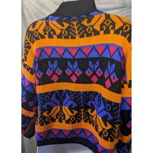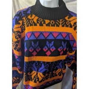 Fun and funky vintage 80s vibrant sweater. It's on bold tones of black, orange, pink, and purple. It has striped and designs of hearts, and abstract geometric designs, and a 3 inch neck. The tag has been cut out so I'm not sure what the brand is. I've found another online and it says the brand is Croquet Club. There is some pilling, but its not an unreasonable amount considering its age. Great nostalgic piece!