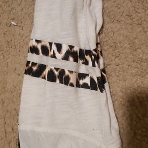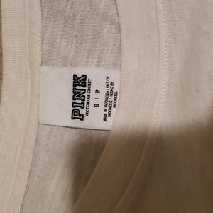 PINK Victoria's Secret long sleeved t-shirt with leopard stripes on the sleeves, size small. More of a thinner material that fits looser, and cream colored, not cracking or stains, just a little worn.