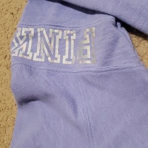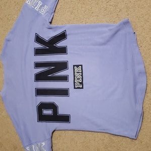 PINK Victoria's Secret pullover long sleeved sweater, size small but fits a little looser. There are a couple stains on the front, the lighter ones not as noticeable. Has the logo on the sleeves and the back, light lavender color.