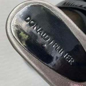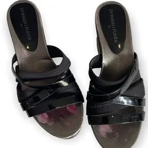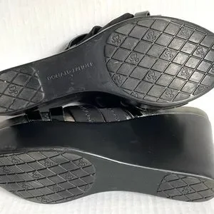 Donald J Pliner Strappy black wedge sandals. Leather and scuba strap upper. Plastic soles. Wear on foot bed, as shown in photos. Size 6. These are a perfect staple show for work and play!