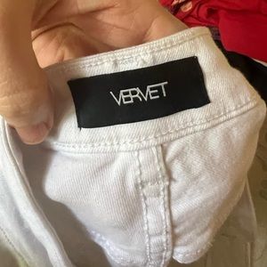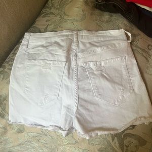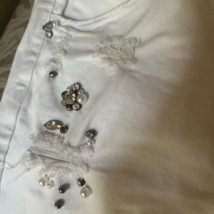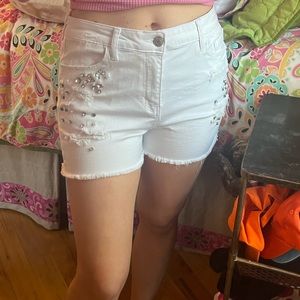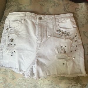 White denim shorts with cute rhinestones and studs on the front! Stretchy material that works well and is flattering with thicker thighs.
