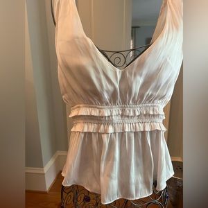 White/cream colored top with a V-neck in the back and flattering waist. Material is very nice and gives this piece more elegance. Great staple to have in your wardrobe! Worn once, size medium!