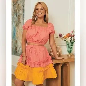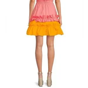 “Coral/Mango” colored LDT Chloe Color block Tiered A-line ruffle skirt. A-line silhouette. Adjustable drawstring/elastic waistband. Hidden pockets on hips. Above knee length. Size 6. Made of 97% Cotton, 3% Polyester. New with tags.