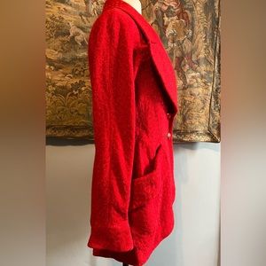 Karl Lagerfeld 1980s Red Jacket. In very good vintage condition. Large collar and beautiful red and gold buttons. Two pockets on the front. 63% Wool, 30% Viscose. Size 42
