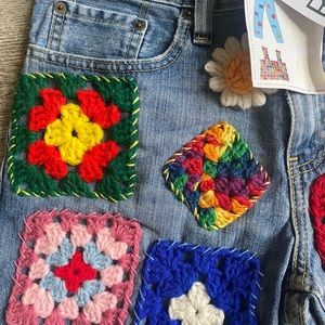 These one-of-a-kind vintage reworked denim shorts are the perfect mix of whimsy and functionality! Reworked by hand in NY from vintage denim, vintage crochet squares and remnants, and recycled thread.