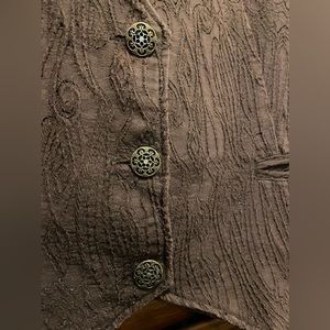 This vest has 2 functional clean pockets and is Fully lined (see photo showing this vest inside out). Gorgeous deep chocolate brown textured cotton fabric. Bought for a friend’s Renaissance outfit & never worn. The camera’s flash/bright light makes fabric look worn in some areas, but it’s not. The High quality rich textured embroidered fabric & gorgeous decorative metal buttons are why I chose this for my friend’s Ren Fest outfit (see close up fabric details). Unfortunately, her chest is too big and I didn’t have time to alter it.