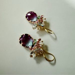 These lovely drop earrings are made with stunning two toned vintage glass stones in blue and purple. The sparkly glass stones are faceted and set in delicate and beautiful gold plated settings dangling from medium length gold plated hooks adorned with sparkling pink, blue, & clear rhinestones for butterflies. Will make a gorgeous gift for someone or a lovely treat for yourself.