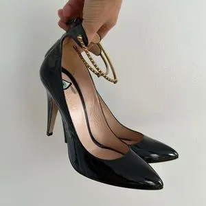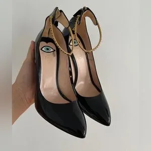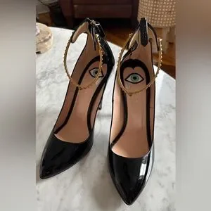 Gorgeous pointy toe, patent leather, Gucci heels with sexy gold decorative ankle strap with panther head on front. Evil eye printed on the inside. Zipper with Gucci tab on the back. Heel measures about 5 inches. Never worn outside of the house. Suuuuper chic and sexy. Made in Italy. Excellent condition.