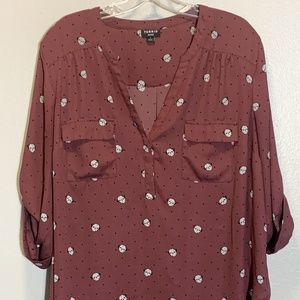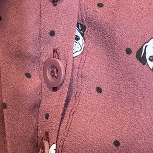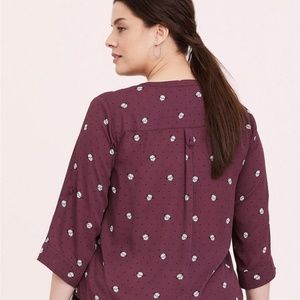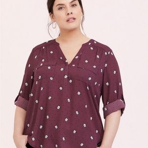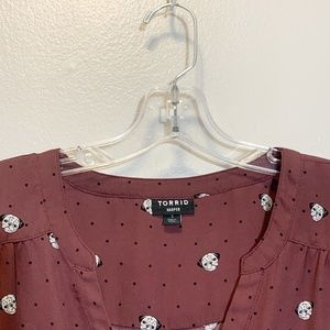 Details: 3/4 Length rolltab sleeves, Chest pockets Split, neckline, Shirttail hem, Plum in color with pug graphics & dots Concealed button down front Polyester Torrid size 1, equivalent to a standard women's size 1X