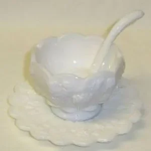 This is a really pretty milk glass Paneled Grape 3-Piece Mayonnaise Set made by Westmoreland Glass. This Set includes the saucer-style under plate, the mayonnaise bowl and the ladle. The under plate and the mayonnaise bowl are signed WG. The spoon is not signed. All three pieces are all in great condition with no chips or cracks. Be sure to search our other Westmoreland glass available.
