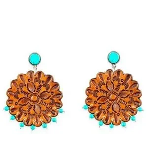 These incredible leather earrings are expertly hand-tooled with a delightful blossom pattern in the 2.25” center. Gentle scalloping on the bottom edge completes the graceful look in the company of the turquoise beads and top cabochon. Beautiful!