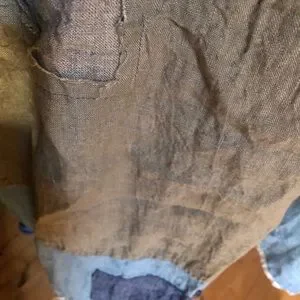 Distressed with amazing hand sewn patches.. hard to find early piece .. true favorite.