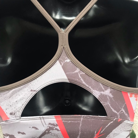 This lovely Reebok sports bra is in like-new condition. Mauve-grey marble print with orange accents fits a size extra small. The tags were removed unfortunately, please comment below for specific measurements. Removable cup inserts*