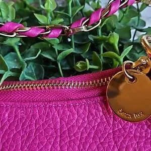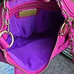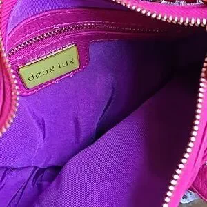 In very good used condition, this is a fuchsia pink with gold hardware Crossbody Purse from Deux Lux. Also, this has a heavy-duty chain shoulder strap. The inside is accessed with a top zip closure and has a main pocket and side zip pocket. Measurements are as follows:
