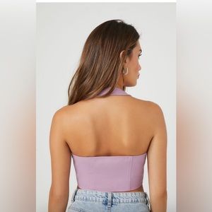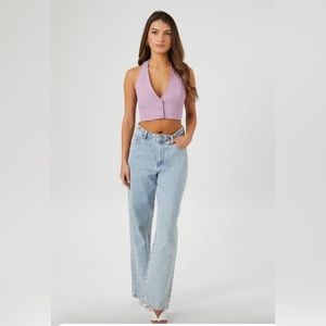 A woven crop top featuring a plunging halter neckline, button-front closures, an open back and front welt pockets. Great on its own or paired over a collared white button up shirt!