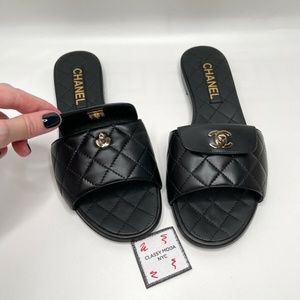 Chanel NIB Black Slides Turnlock Gold CC Logo Quilted Slide Flat Flop Sandals