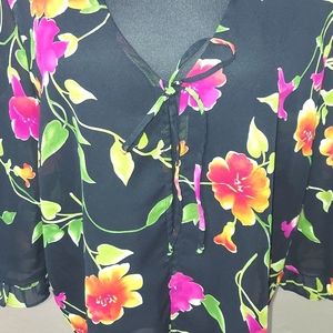 Bright floral design, sheer, ruffled quarter sleeves, tie close.