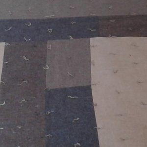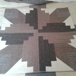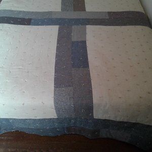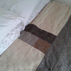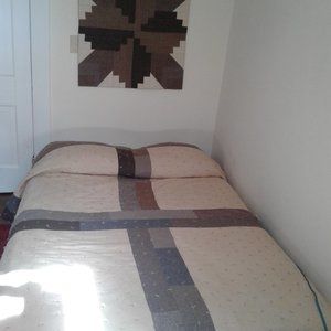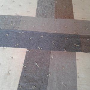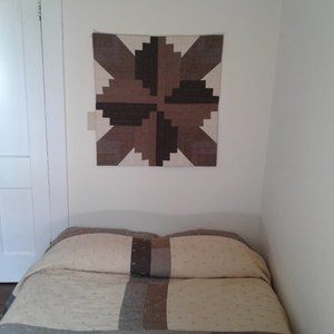 This is a One .Of A Kind Hand Crafted Quilt.. lt was made from Wool and Wool Blend used Garments Skirrts and Slacks and Jackets.. It was Hand Tied ( with alot of Ties) with a Polyester Filling and a Hand sewn Hem. It would go Greate with a Farm House Decor. The reverve side is Flannel and is pieced together with a Strip Quilt Cross Design. It could go on a Queen size or Full size Bed. It is 100 " × 127". It comes with an Acron Design Wall Hanging made from Heavier Weight Wool and Wool Blend Garments.. lt is 31 1/2" × 32 1/2"