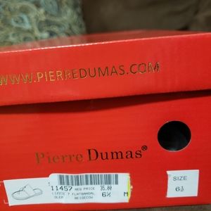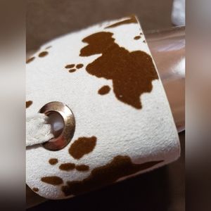 1 pair women's Pierre Dumas flat sandals, size 6 1/2 . Beige brown cow print. New, took out of box for photos. sold for $35.00.