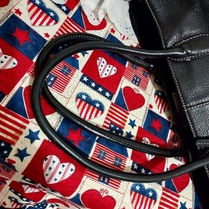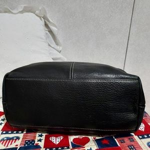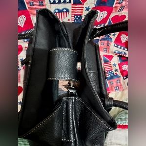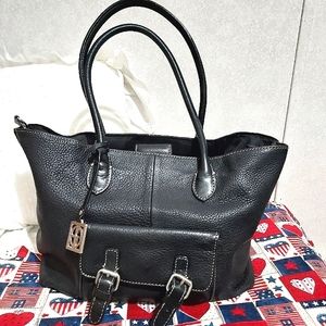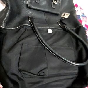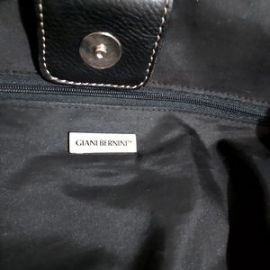 Giani Bernini black leather shoulder bag is a super cute shoulder bag. It has silver hardware and a silver emblem that hangs from one of the straps. The straps are in excellent condition. On the outside, there's a pocket with buckles that have magnetic closures and another pocket on the other side that zips closed. There's magnetic closure and a hook closure at the rip of the bag. On the inside, there are 2 pockets and a zip pocket on the other side. There is a silver emblem under the zip pocket inside of the bag. Can fold sides of the bag in or out to give yourself a bit more room.